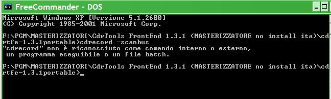 ![]() ![]() Registered Member #6449 Joined: Wed 10 Oct 2007 - 21:16Posts: 434 ![]() | Questo è ciò che mi risponde (quel maleducato del mio pc ) F:\PGM\MASTERIZZATORI\CdrTools FrontEnd 1.3.1 (MASTERIZZATORE no install ita)\cd rtfe-1.3.1portable>cdrecord -scanbus "cdrecord" non è riconosciuto come comando interno o esterno, un programma eseguibile o un file batch. ![]() [ Edited Sat 29 Mar 2008 - 10:10 ] | ||