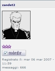 ![]() ![]() ![]() Registered Member #3184 Joined: Tue 06 Mar 2007 - 11:52Location: Busto Arsizio Posts: 3301 ![]() | 666 Questo è il mio post numero 666 quindi niente di più appropriato di Don Zauker esorcista -Link- -Link- inserito nel mio avatar per contrastare il potere demoniaco di questo messaggio.... ![]() BUAHAHAHAHAHHAHAHHAHAHAHAHA [ Edited Sat 13 Sep 2008 - 22:23 ] | ||